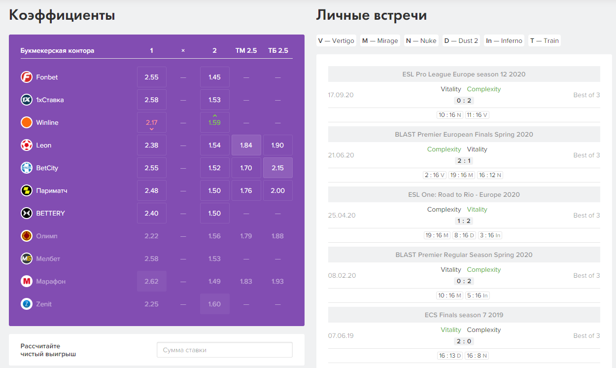 Личные встречи – матчи за последние два года. Это оптимальный временной отрезок, поскольку в CS:GO составы регулярно меняются, а данные, например, за 2015 год только дезориентируют бетторов.
