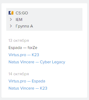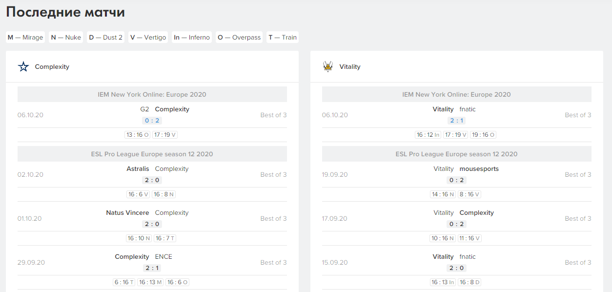 Далее идёт статистика последних матчей команд: название турниров, счета и результаты на конкретных картах.