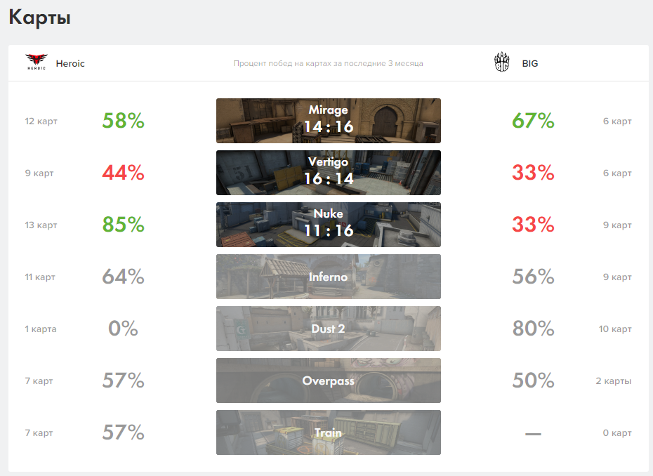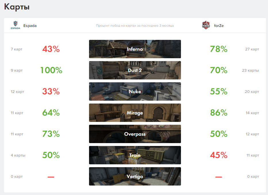 Серым цветом указано суммарное количество карт, зелёным – процент побед. Если он у команды ниже 50%, то значение выделяется красным цветом, если 50 и выше – зелёным.