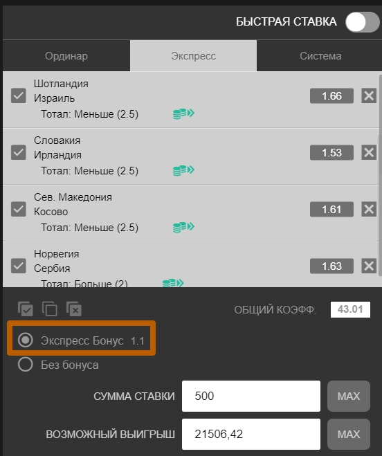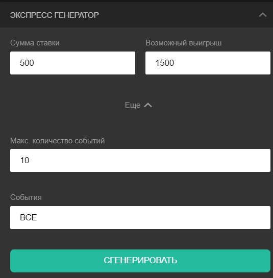 Система автоматически под эти критерии собирает экспресс. Игрок уже сам решает, стоит ли рисковать ставкой на предложенные события или запустить генератор ещё раз.