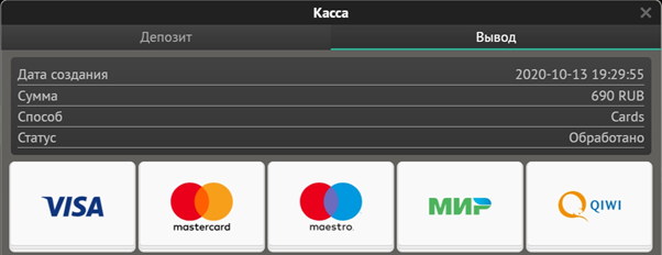 Оказалось, что заявку на вывод следует искать в меню «Касса», через которую совершаются пополнение баланса и выплата выигрышей. Во вкладке «Вывод» находится история заявок на выплаты.