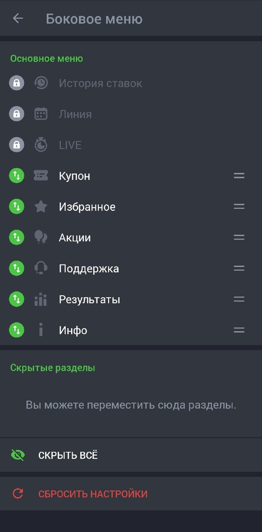 Кстати, пункты бокового меню можно настроить под себя в настройках: нельзя трогать только историю ставок, линию и лайв, а остальные разделы можно скрыть или поменять местами — небольшая, но удобная фича для оптимизации рабочего пространства приложения.
