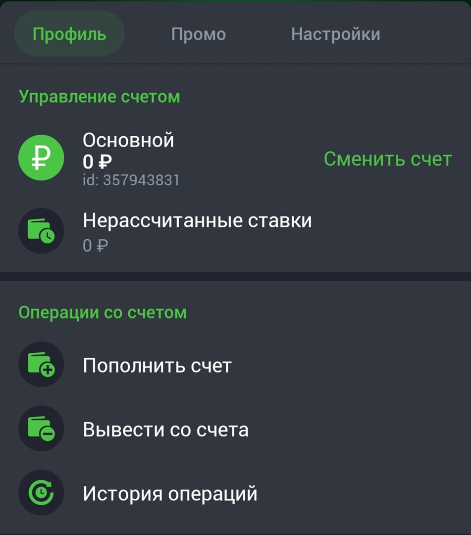 Первое, что бросается в глаза, — это удачно подобранная цветовая гамма: сочетание тёмно-серого, зелёного и белого выглядит так, что можно простить отсутствие возможности сменить тему. В остальном интерфейс приложения действительно точь-в-точь мобильная «1хСтавка»: те же кнопки, то же меню, та же последовательность блоков на боковой панели.