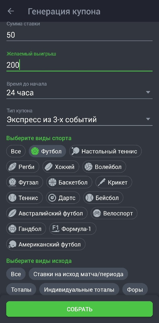 Ну и третий, один из самых интересных пунктов — это наличие генерации купона. Работает она достаточно просто: игрок выбирает размер ставки, желаемый возможный выигрыш, время до начала, вид купона (ординар, экспресс с энным количеством событий), вид спорта и интересующий исход (П1/П2, тоталы, форы и т.д.).