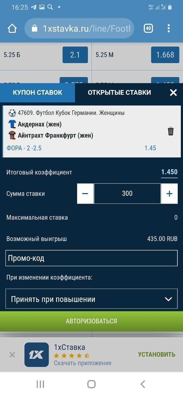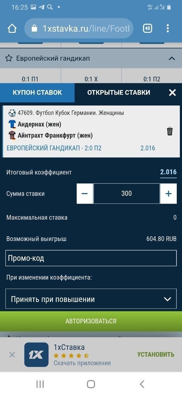 Ниже приведу самый свежий пример. В матче женского Кубка Германии «Андернах» — «Айнтрахт Франкфурт» 21 марта на Ф2(-2.5) дали коэффициент 1.45, а на европейский гандикап «2:0, П2» — 2.02, хотя это абсолютно одинаковые ставки. Я с удовольствием забрал второй вариант.