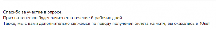 Для того чтобы получить приз, в конце опроса будет необходимо оставить свой номер телефона и отправить письмо на почту freebets@ro.ru. В письме нужно указать свое имя, номер телефона, адрес электронной почты и название матча РФПЛ сезона 2017/2018, на который вы хотели бы попасть. Ответ на это письмо придет в течение 24 часов после прохождения опроса. Если же свое письмо с контактными данными вы отправите в пятницу после 14:00 по Москве, ответ поступит в понедельник.