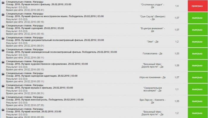 Остается надеяться, что большинство успело поставить по хорошему кэфу, в конце 2015 года давали - 2.70, в середине февраля - 1.14, а прямо сейчас - 1.01. Я не успел, а за 1.01 играть не стану. Даже победа Лео Месси за Золотой мяч в этом году оценивалась выше, хотя вероятность триумфа Месси была более вероятной. Мало ли что еще придумали кинокритики по отношению к другому Лео?!