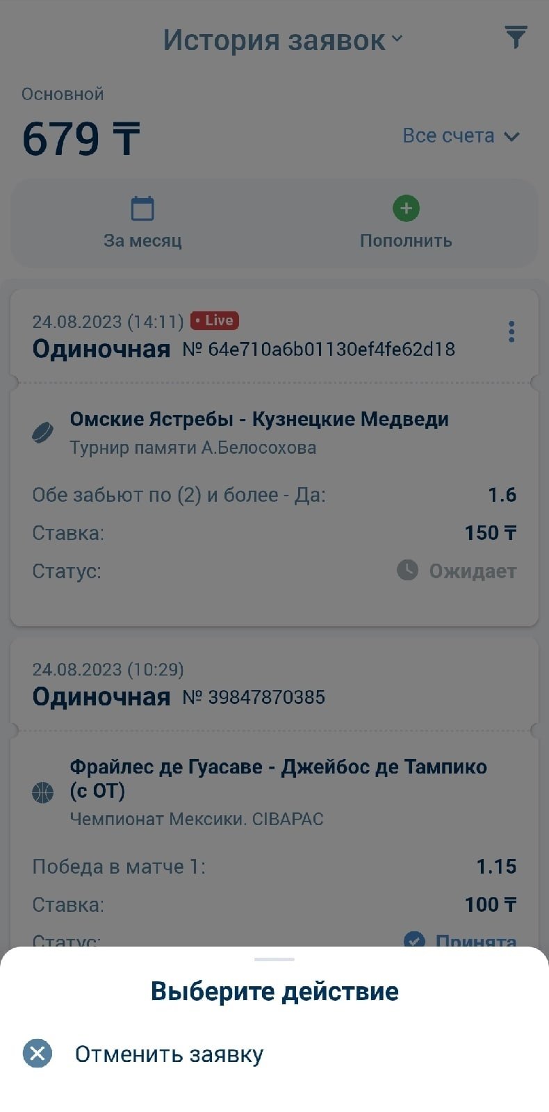 Заявка отражается в истории ставок со статусом «Ожидает». Купон нельзя изменить, но в случае чего заявку можно просто отменить.