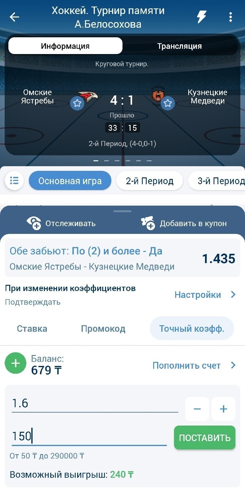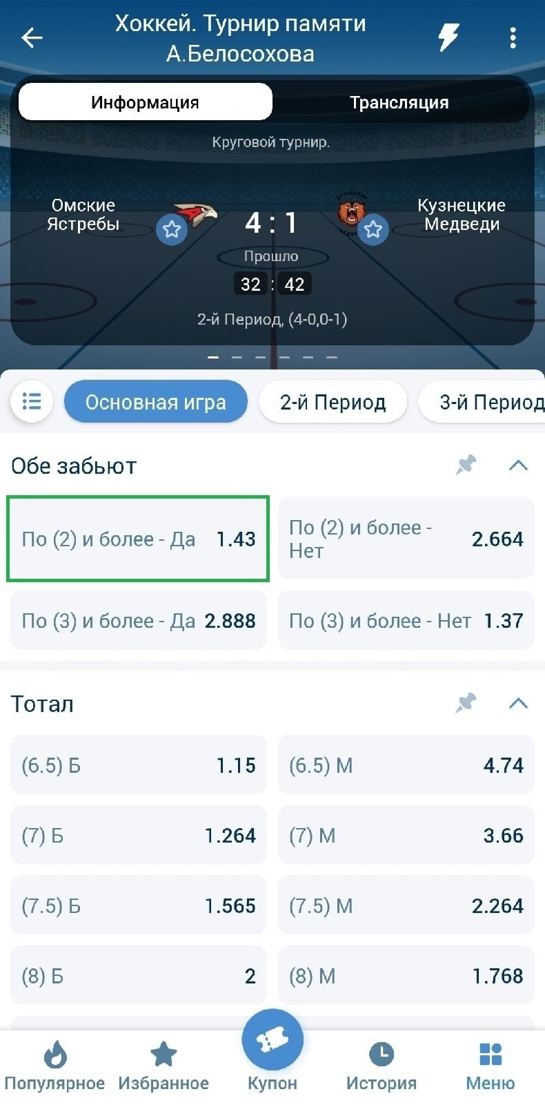 Например, игроку кажется, что в матче «Омских Ястребов» и «Кузнецких Медведей» назревает ещё одна шайба вторых, но грузить за 1.43 — слишком непривлекательно. Переходим в нужное меню в купоне, выбираем кэф 1.60, пишем сумму ставки и ждём — чем меньше времени будет оставаться до конца матча, тем выше будут котировки, поэтому шансы есть.