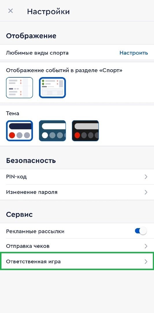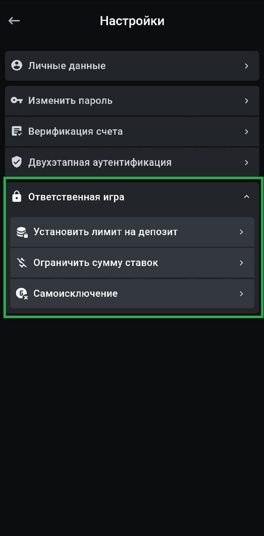 Под ответственной игрой подразумеваются самоограничения, которые может ввести себе игрок с помощью букмекерской конторы: время, проведённое на сайте или в приложении БК, лимиты на сумму ставок и депозитов за определённый отрезок и, конечно же, возможность на время или навсегда изолироваться от игры.