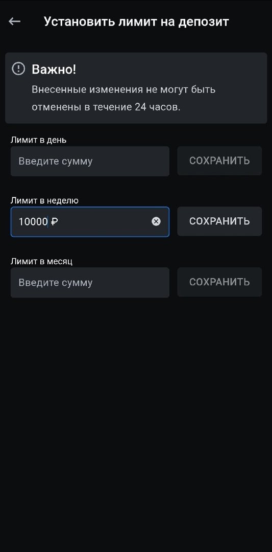 Установить лимит на депозит — игроки самостоятельно могут ограничить суммы депозитов в день/неделю/месяц. Снять или изменить ограничения можно через 24 часа после их установки.