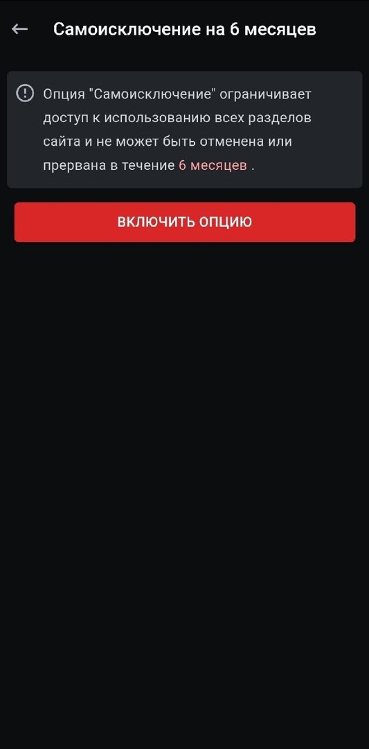 Самоисключение — ограничение доступа ко всем разделам сайта, которое не может быть прервано в течение полугода.