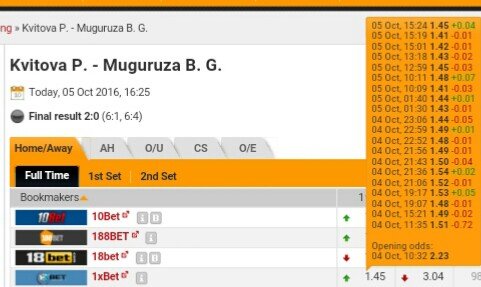 Надеялся на ровную линию, т.к. те, кто ставит чисто по рейтингу и стате, а не видит живой теннис наверняка думали "*****, какой принципиальный матч, мугуруса ведь третья, а Квитова нестабильна". Да и буки как-то не решались ставить Петру(16-ю) против 3 ракетки такой уж явной фавориткой.