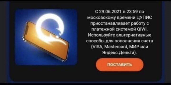 Клиентам букмекерских компаний, которые входят в Первую СРО и работают через Первый ЦУПИС, начали приходить оповещения о том, что в 23:59 МСК 29 июня работа с платёжной системой QIWI приостанавливается.