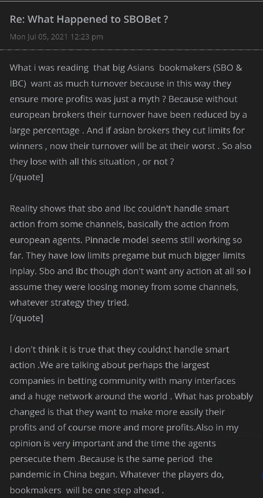 Стоит понимать, что убытки по некоторым рынкам есть у всех контор, которые позволяют играть профикам. Просто кто-то, как Pinnacle, продолжает гнуть свою линию, предпринимая нерадикальные методы борьбы с этим (например, снижение лимитов), а кто-то, как SBOBET, решает кардинально изменить взаимоотношения с клиентами.