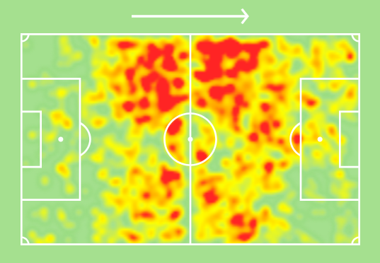 Джуд качественно контролирует мяч, стабильно обостряет пасами, идёт в обводку, умеет отбирать, хорошо читает передачи соперников и блокирует их, активно работает в обороне (и внизу, и наверху), прессингует и собирает много фолов. Но есть одна вещь, которую он не любит или не признаёт, — классические диагональные переводы в стиле Бускетса, это не в крови Джуда. Зато посмотрите на его тепловую карту. Фантастика, он везде.