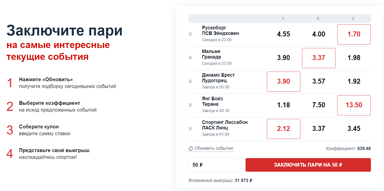 «Суперэкспресс» – это чистой воды тотализатор, когда бетторы играли не против компании, а против друг друга, формируя общий призовой фонд. Поэтому «Фонбет» отказался от этого предложения и взамен запустил аналог «Суперэкспресса» в виде конструктора. Клиенту случайным образом предлагается пять футбольных матчей, в которых нужно угадать исходы – П1, П2 или ничья. Если подборка событий не устраивает пользователя, то он может сколько угодно раз нажимать «обновить» и получать новый возможный экспресс. Совсем скоро мы расскажем о конструкторе «Фонбета» более подробно.