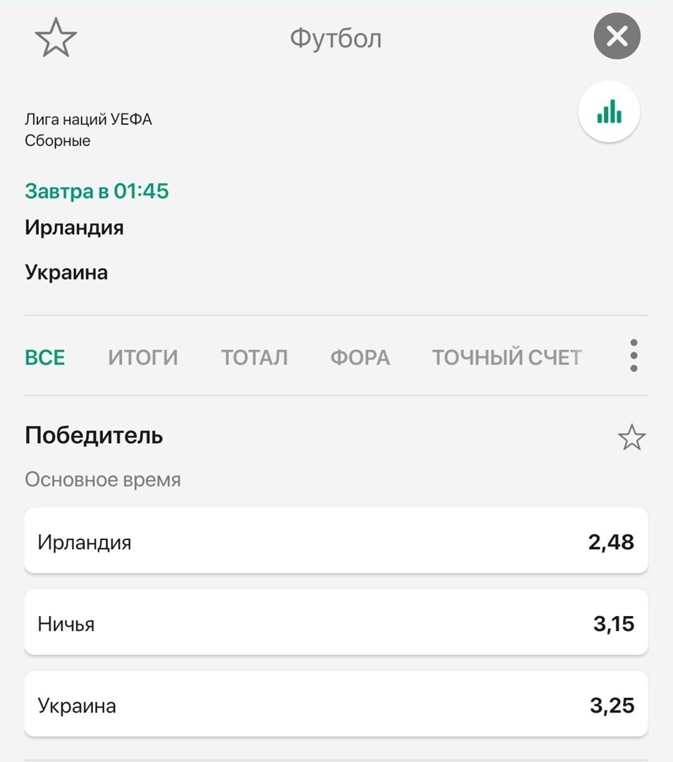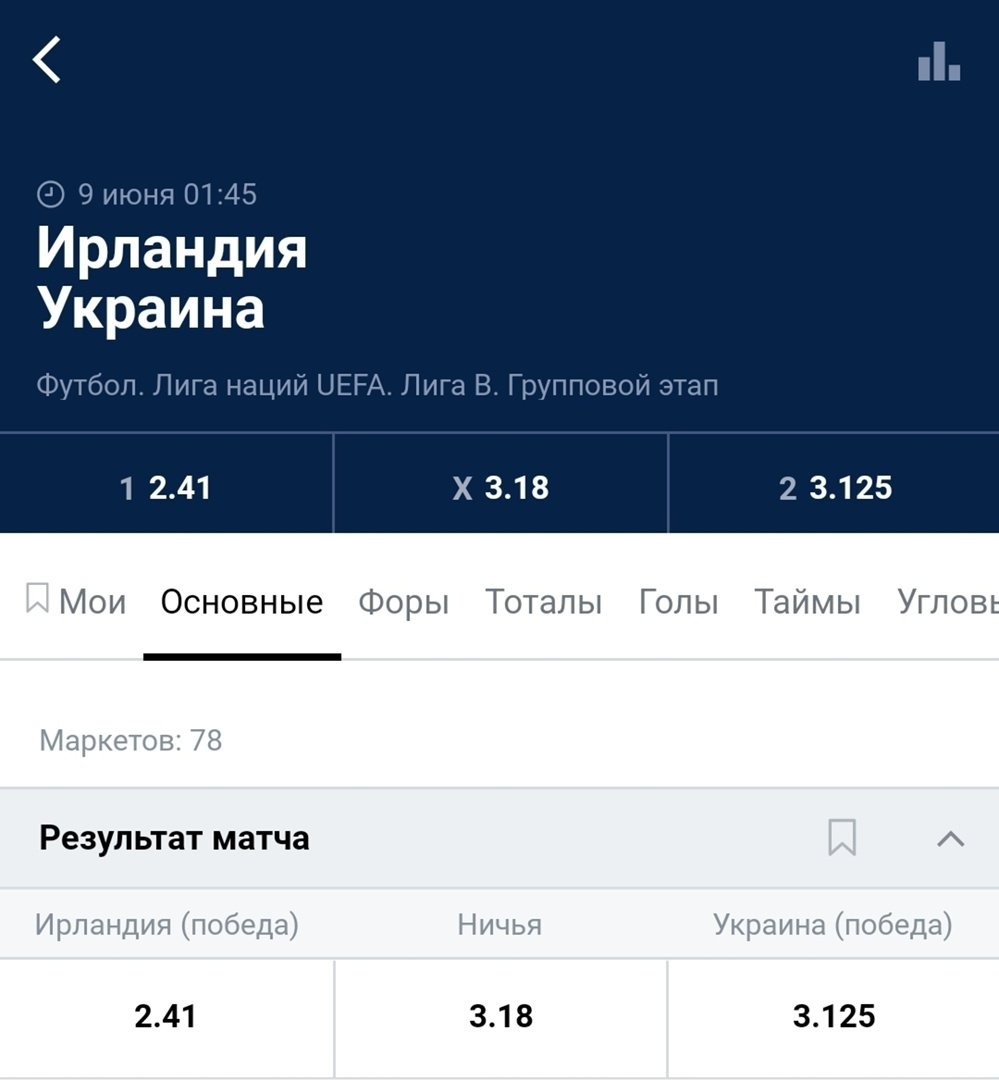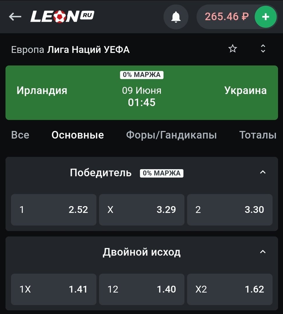 Всё познаётся в сравнении. Для примера возьмём линию БК «Леон» на матч Ирландия — Украина с нулевой маржой и сопоставим котировки с «Марафоном», у которого самые высокие кэфы на футбол, согласно рейтингу БК по размеру коэффициентов, и «Лигой ставок», которая в этом списке занимает последнюю строчку.