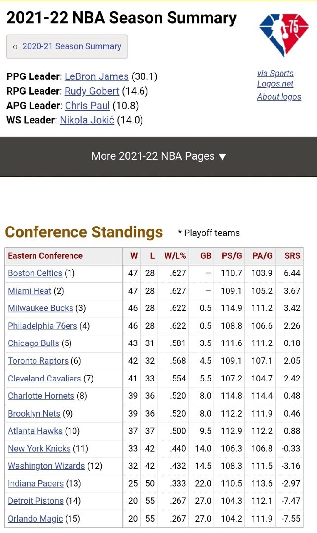 На странице сезона доступны турнирные таблицы по конференциям и дивизионам, продвинутая статистика команд, а также статистика и списки лидеров по солидному числу индивидуальных показателей: набранные очки, фолы, отскоки и многое-многое другое.