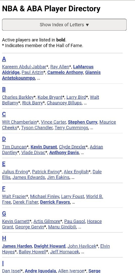 Портал утверждает, что собрал статистические данные абсолютно всех игроков, когда-либо принимавших участие в матчах НБА. Проверить это утверждение проблематично, но достаточно взглянуть на алфавитное оглавление, чтобы понять: эти ребята вряд ли преувеличивают.