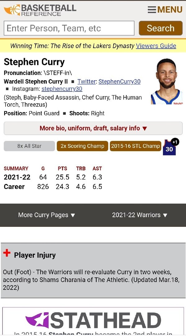 Stathead — продукт компании Sports Reference с ещё большим количеством статистики, инфографики и всевозможными фильтрами информации по всем популярным в США видам спорта: футболу, американскому футболу, бейсболу, хоккею и баскетболу. После первого бесплатного месяца подписка на один вид спорта будет стоит 8 долларов в месяц, однако для любителей ставок вполне достаточно и бесплатного функционала сайта.