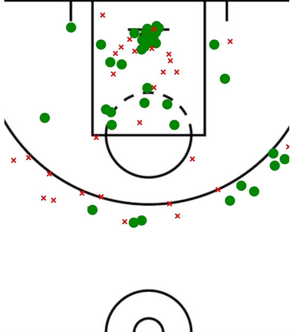 Ещё один интересный функционал — карта бросков для всей команды и конкретного игрока: зелёным отмечены успешные попытки, а красным — неудачные. Трудно представить более наглядное распределение бросков.
