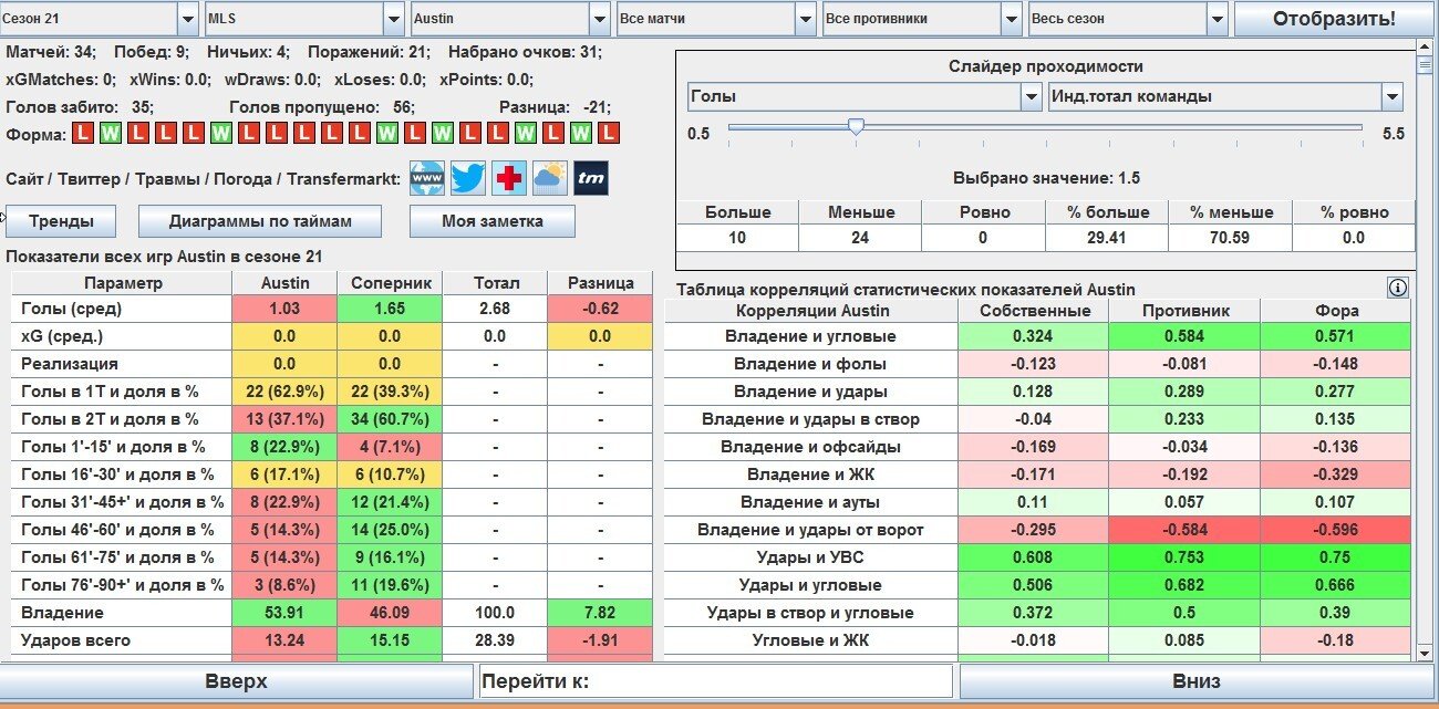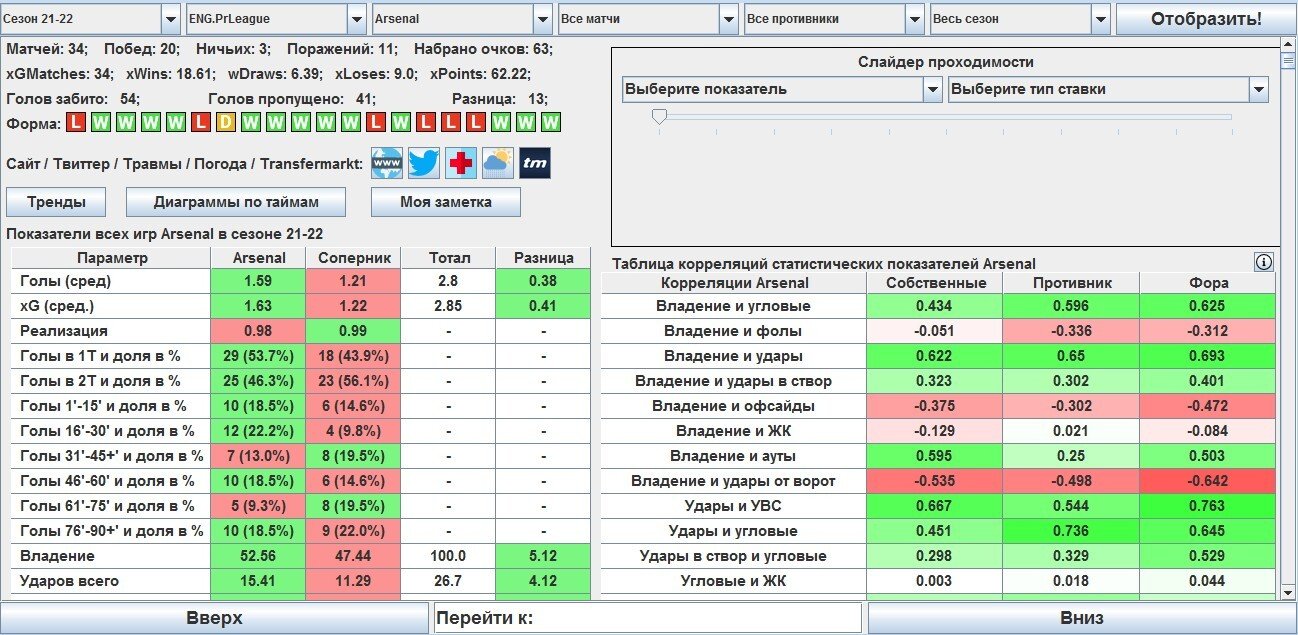 В разделе статистики команды можно найти не только голые цифры и коэффициенты корреляции. Одна из самых прикладных функций приложения — слайдер проходимости, позволяющий отследить, сколько раз выбранный исход наблюдался в матчах команды.