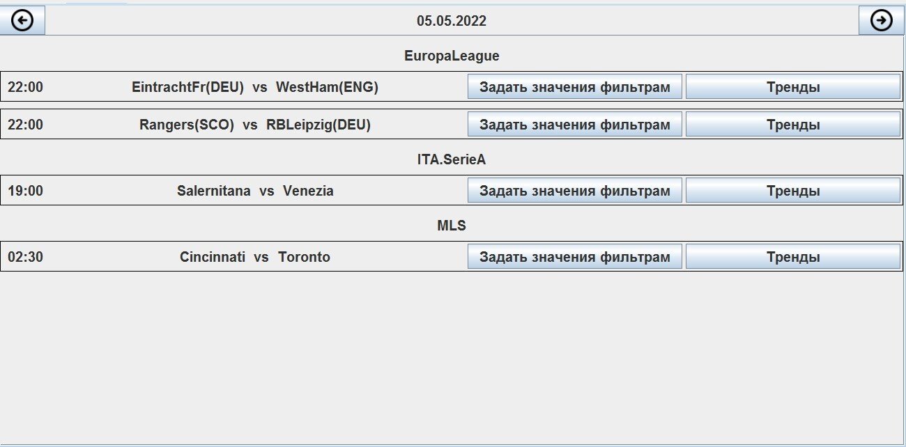 Напротив каждого матча пользователям доступны две кнопки: «Тренды» и «Задать значение фильтрам». С первой всё плюс-минус понятно: кликнув на неё, игрок получит справку обо всех статистических закономерностях команд-участниц встречи.
