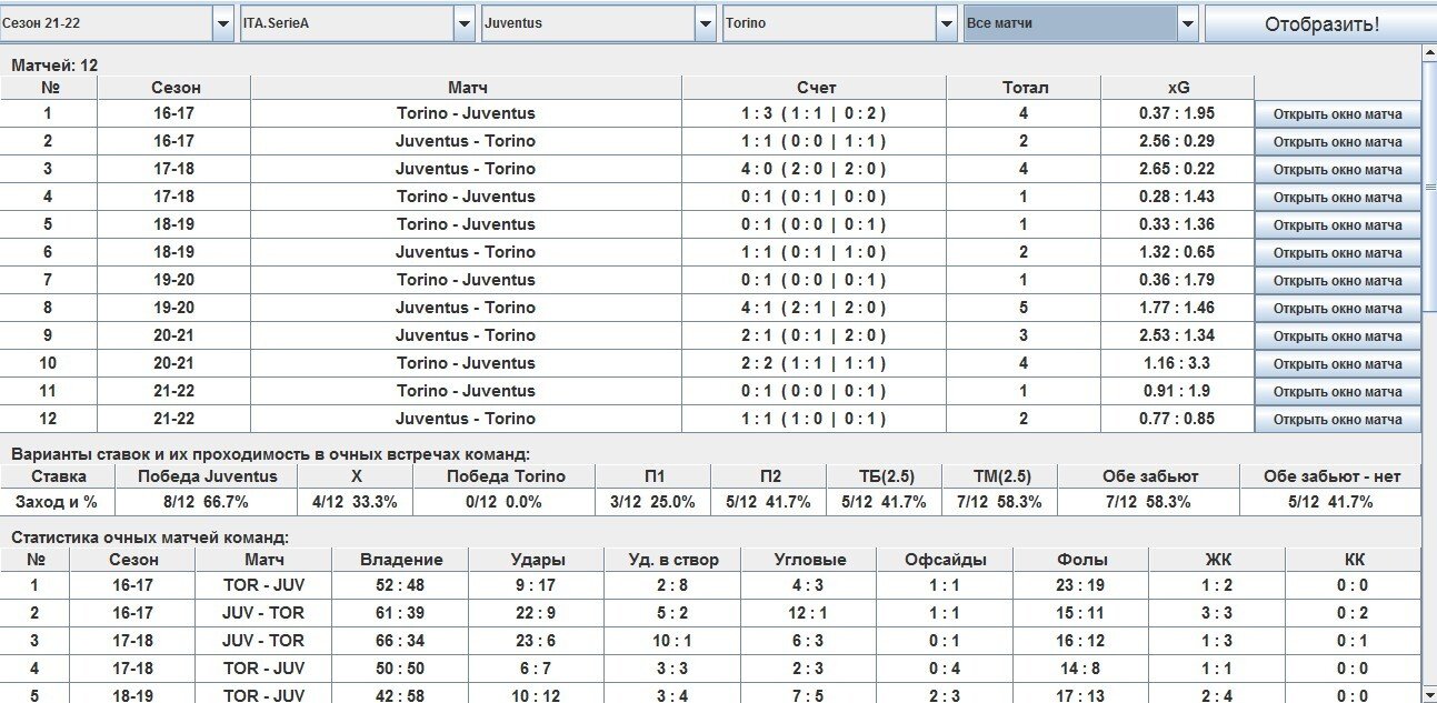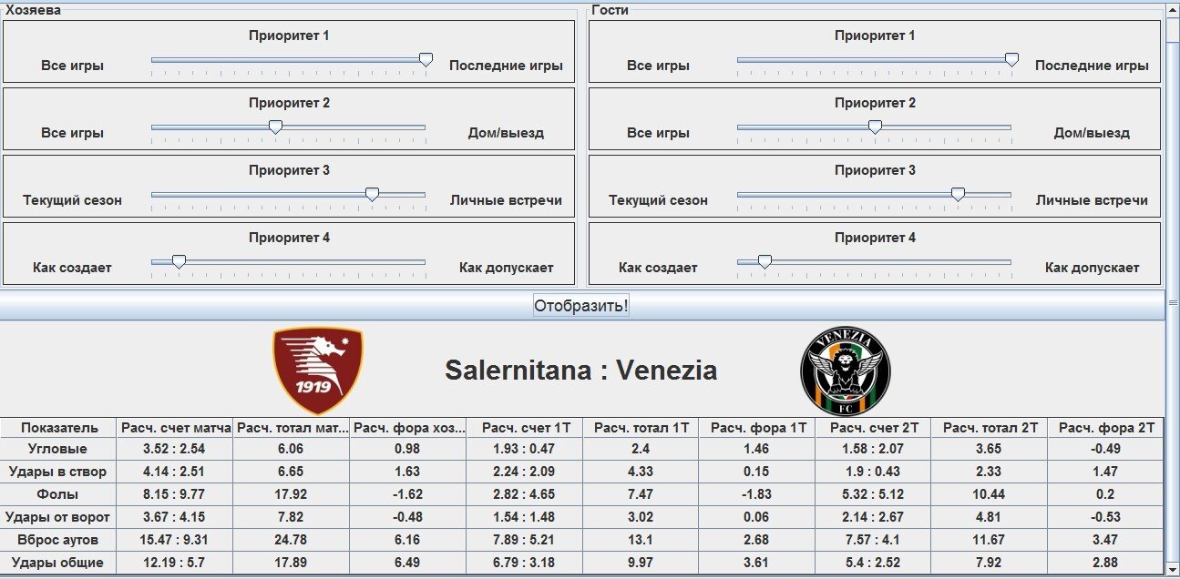 Прогнав огромный массив данных через четыре приоритета, программа выдаёт итоговые значения — расчётный счёт по показателю в матче, каждом тайме и расчётную фору.