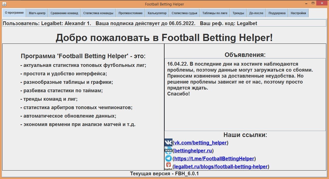 У ресурса два направления и две отдельные программы соответственно: футбольная и хоккейная. Начнём с функционала Football Betting Helper, а поможет нам разобраться с ним основатель проекта Михаил Гоморов.