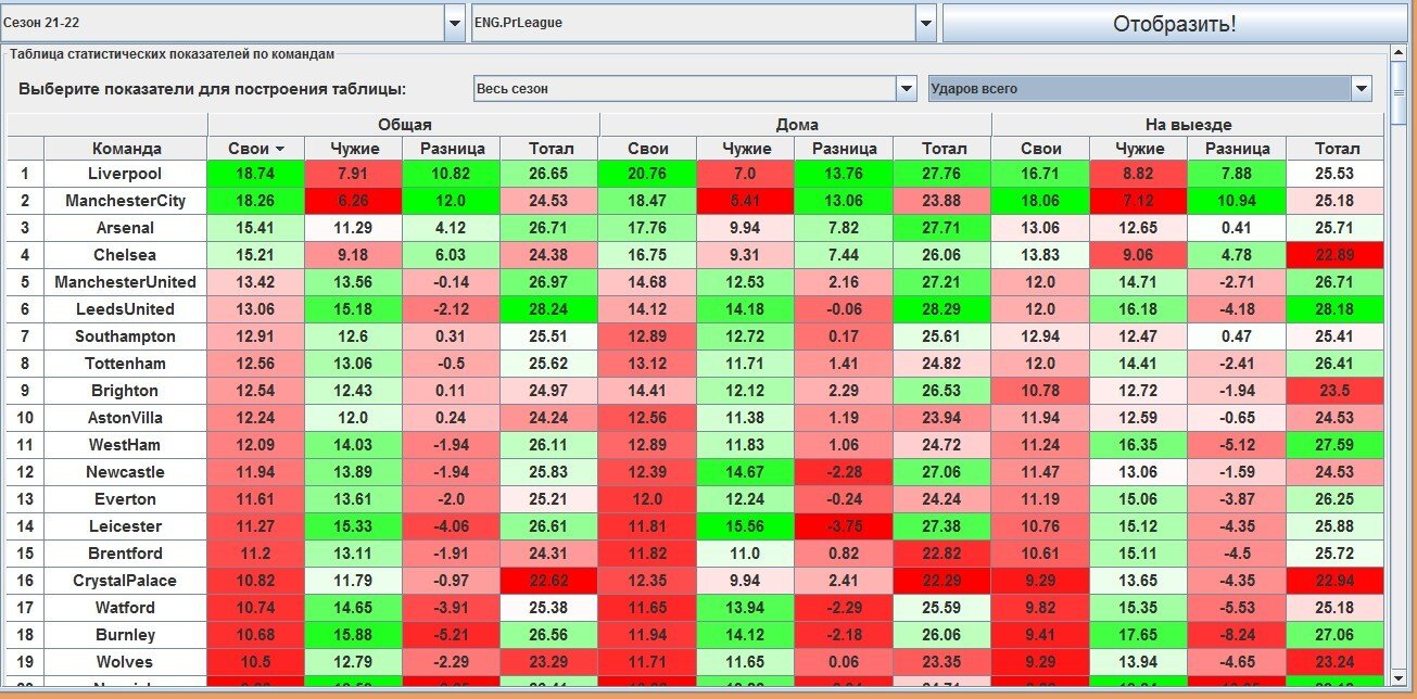 Для каждого отдельного чемпионата можно построить таблицу по интересующему показателю. Сделав пару кликов, можно получить подробнейшие расклады по условным ударам по воротам в АПЛ: сколько команда бьёт сама (дома, в гостях и в общем), а сколько позволяет соперникам.