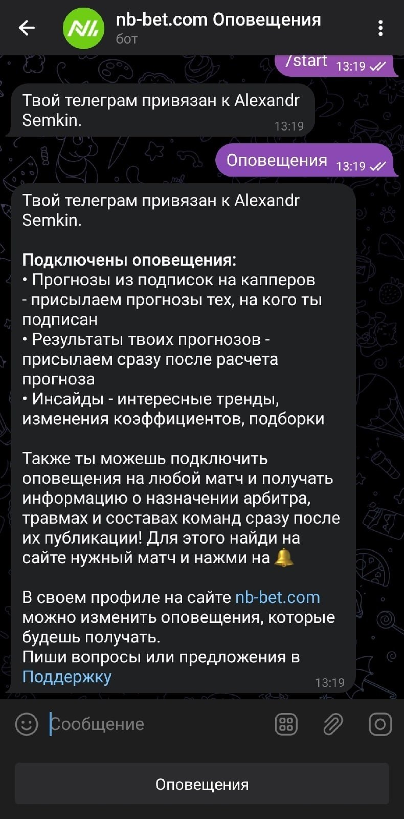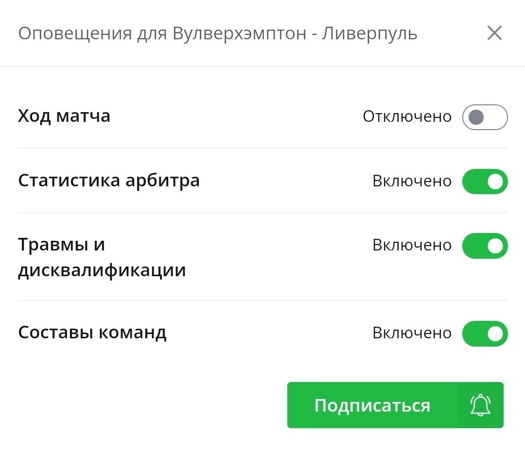 Через бота можно следить за назначением судей: для этого достаточно нажать на колокольчик на странице матча и выбрать соответствующий тумблер. Важно: для работы бота не забудьте привязать телегу в профиле.
