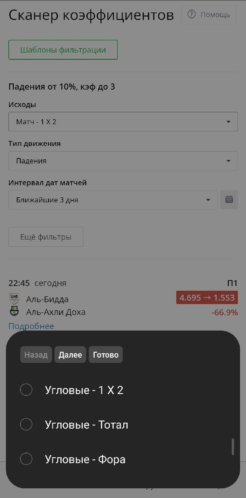 Но самый интересный из них — это сканер букмекерских коэффициентов. В бесплатной версии можно отследить только движение линии на исход, с премиум-аккаунтом — вплоть до линии на угловые.