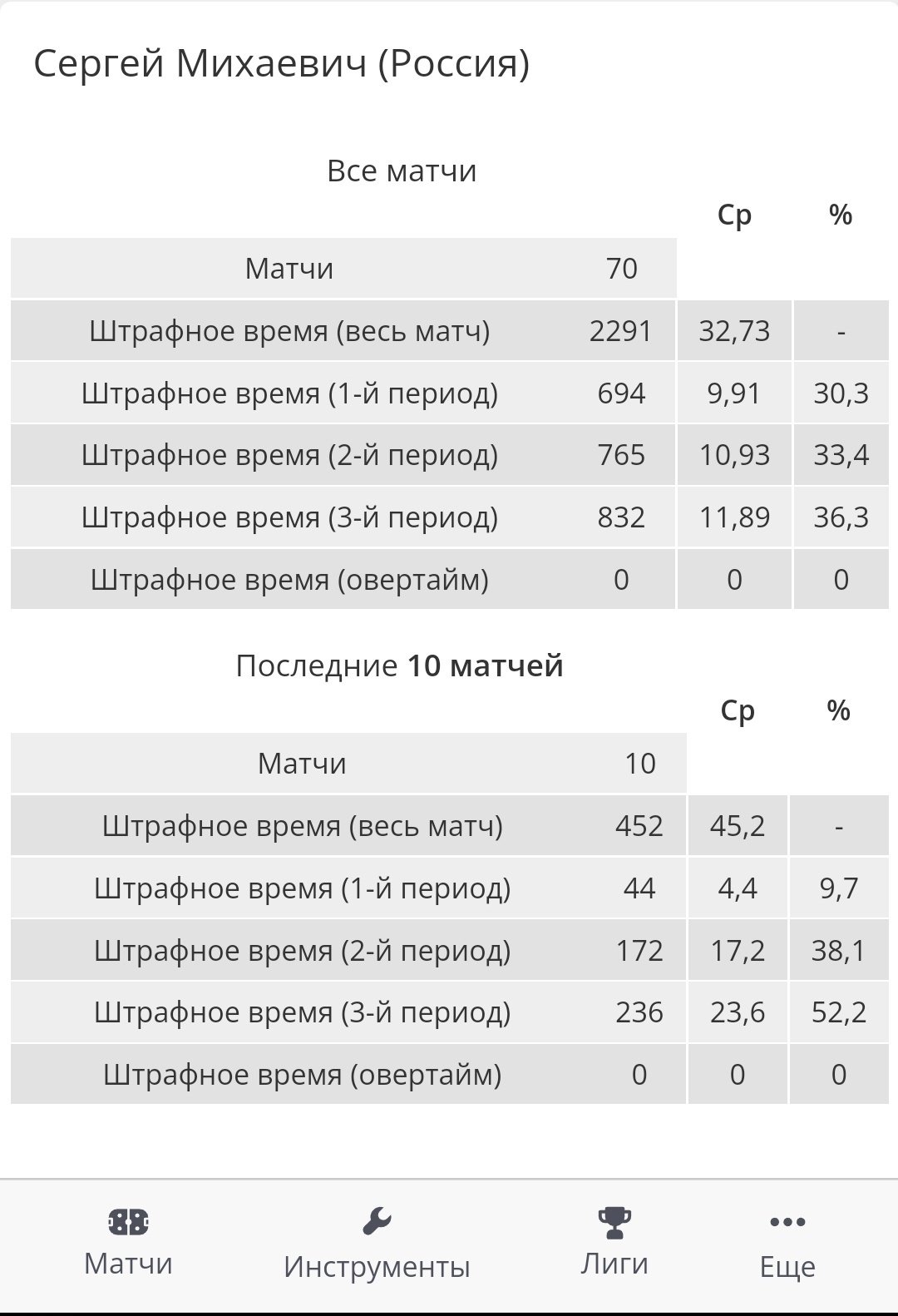 В профиле каждого арбитра есть цифры за выбранный период (устанавливается в фильтрах) и за всё время, а также действующие тренды и статистика последних матчей.