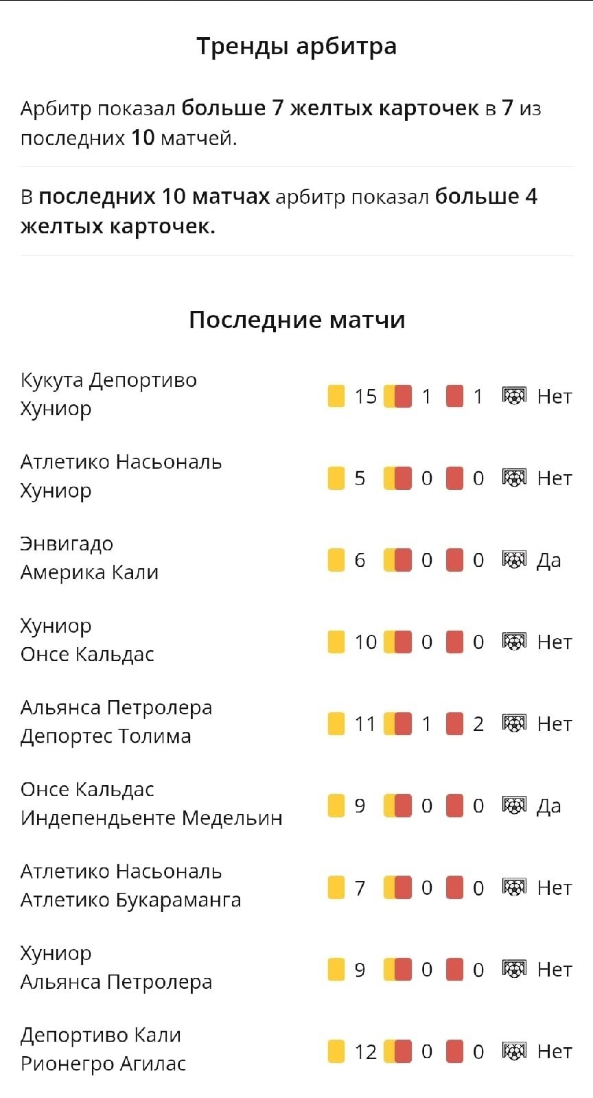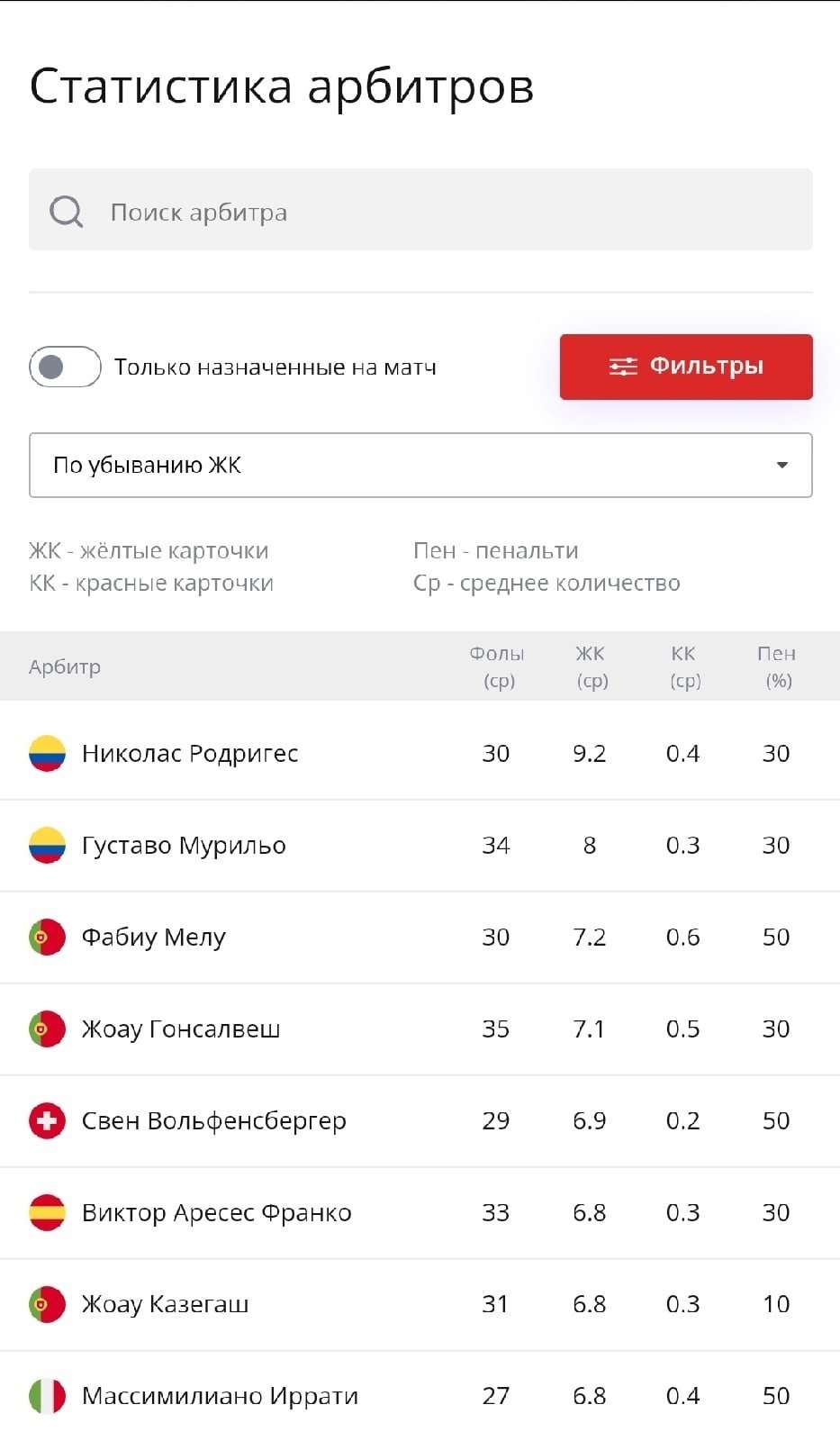 Ресурс собирает статистику по жёлтым и красным карточкам, фолам и пенальти. Есть возможность найти самого строгого (или мягкого) рефа и следить конкретно за его назначениями либо, наоборот, анализировать стату уже назначенного судьи.