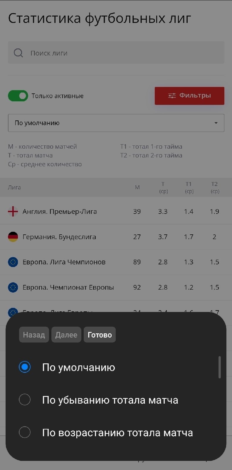 Сайт парсит данные по огромному списку чемпионатов, формируя удобные сводные таблицы. Во-первых, с помощью фильтрации можно найти самый результативный чемпионат в текущем сезоне или турнир с наибольшим количеством голов в 1-м тайме.
