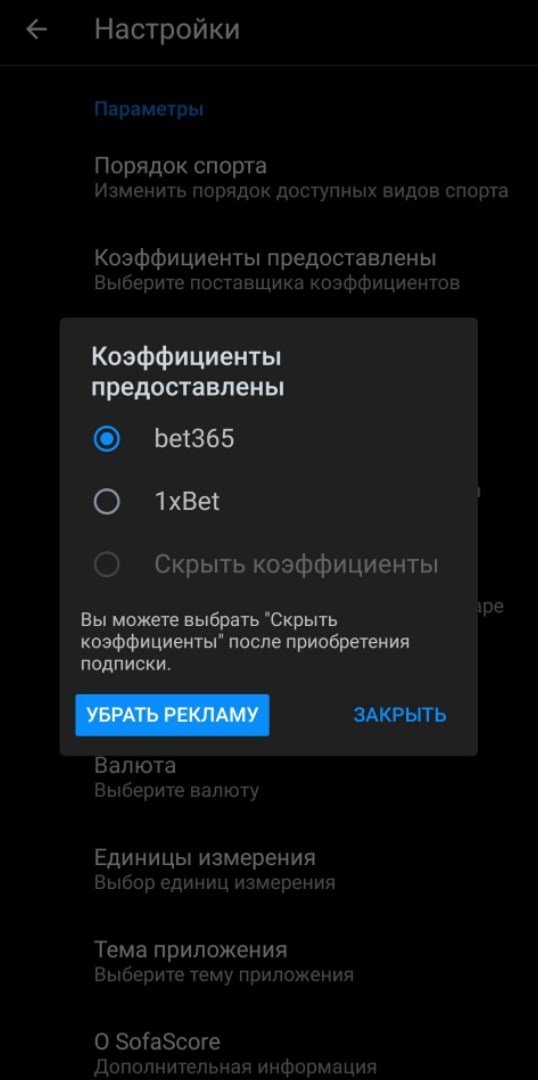 SofaScore предлагает коэффициенты исключительно двух букмекерских контор — bet365 и 1xBet. Обе являются нелегальными на территории Российской Федерации. Выбрать БК, чьи котировки ресурс будет показывать игроку, можно в настройках. Там же можно и вовсе скрыть коэффициенты, но эта функция доступна лишь по платной подписке — всего 100 рублей в год кстати.