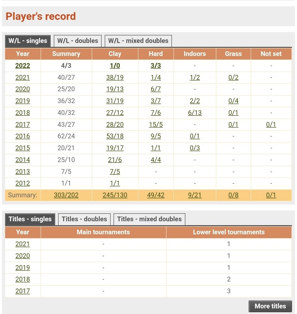 По каждому спортсмену ведётся статистика побед и поражений на каждом покрытии в одиночном разряде, парном и миксте, которая к тому же разбита по годам. Функция позволяет буквально за пару минут оценить, на каком покрытии теннисист показывает лучшие результаты. Незаменимая информация, особенно когда речь идёт о не самых именитых игроках.