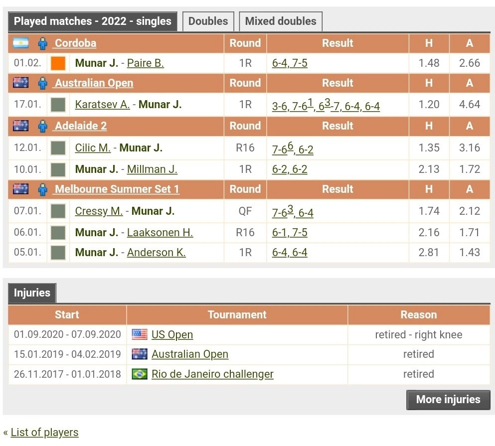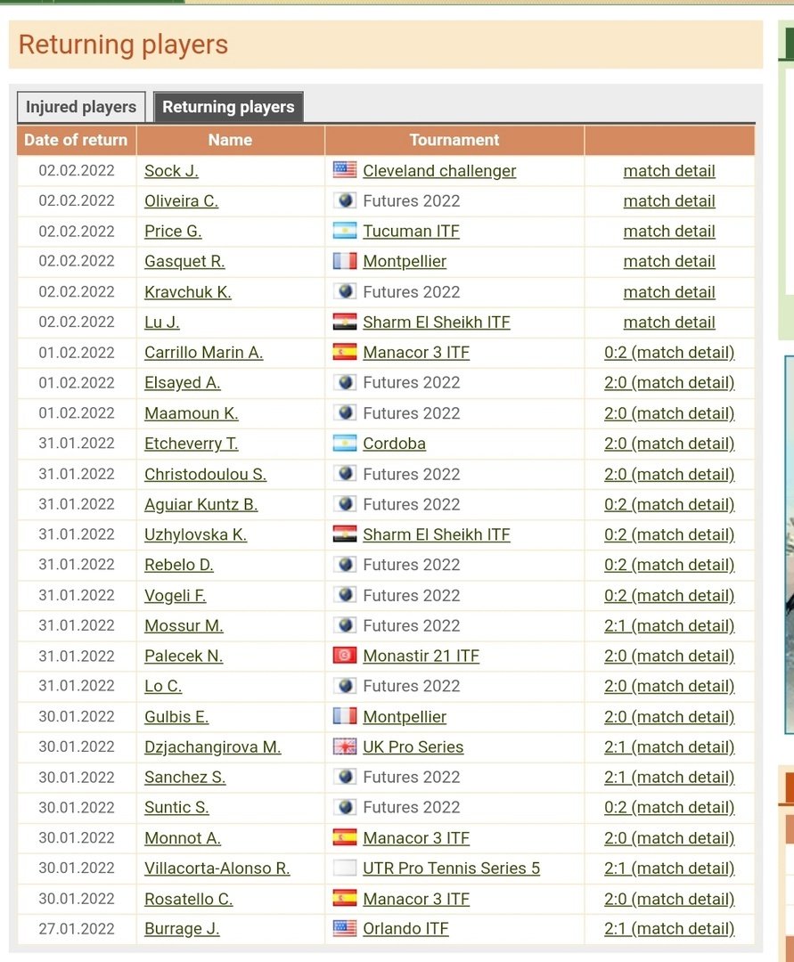Информация о теннисистах, которые только что залечили травму, представлена в виде таблицы: теннисист, дата возвращения на корт и турнир. Единственный минус — чтобы узнать, как долго спортсмен бездействовал из-за повреждения и насколько оно было серьёзным, нужно перейти в профиль.