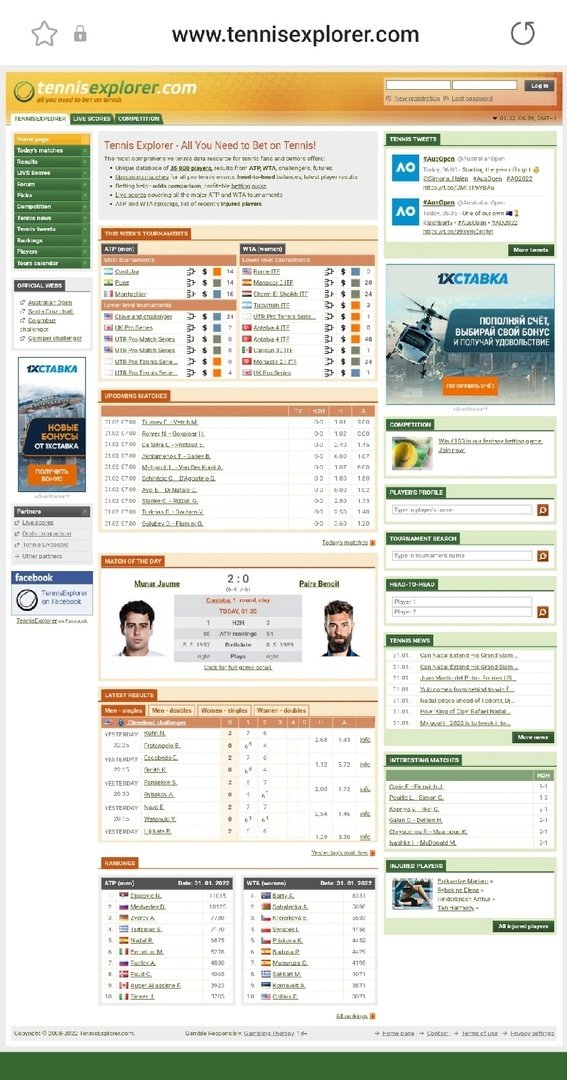 Главное неудобство — отсутствие мобильной версии. Если попытаетесь открыть Tennis Explorer с браузера смартфона, то будете неприятно удивлены: картинка не помещается в ширину смартфона, а если масштабировать так, чтобы видеть всю страницу, то кликнуть пальцем на строку меню или поиска практически нереально.