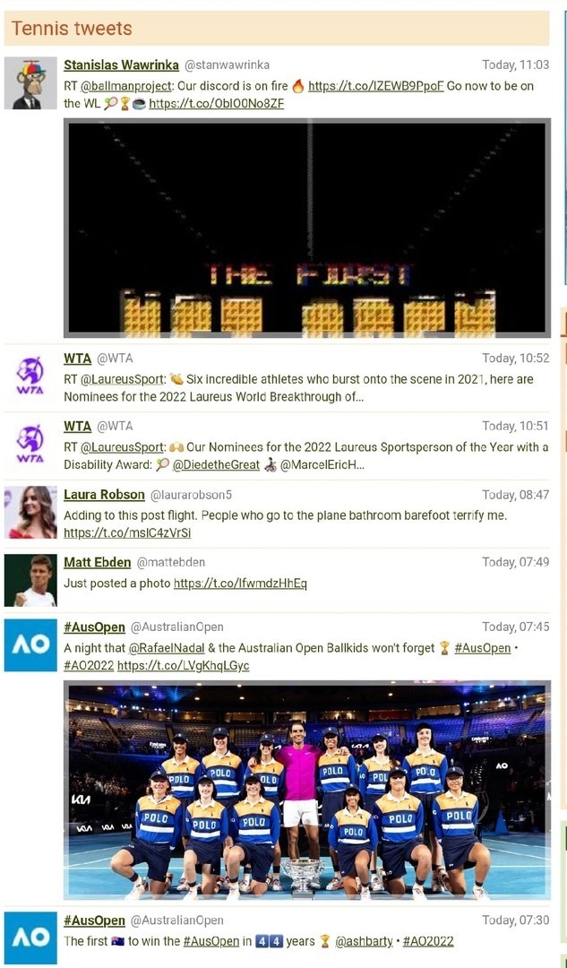 Но главная фишка — это собственный Twitter Desk, который собирает твиты всех официальных теннисных аккаунтов, причём как организаций, так и конкретных спортсменов.
