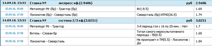 15.09.18 17:30 Витязь - Слован Бр Результат на 10:00 мин. ТБ(0.5) 1.93