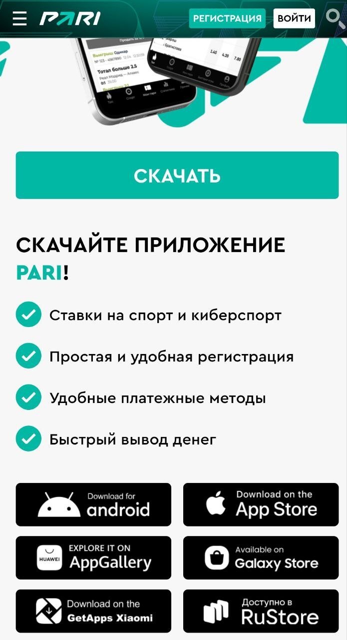 Скачать «Пари» на телефон можно с официального сайта букмекера или в нескольких магазинах приложений: