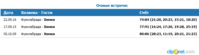 Эти команды в очных встречах встречались всего лишь раз, в прошлый раз эти команды провели один товарищеский матч где победили игроки Химки (84:74) и это с учетом того что испанская команда на тот момент была фаворитом. Прошел месяц и теперь поменялось все наоборот, теперь Химки фавориты. Именно у гостей этой встречи лучший подбор игроков на данный момент которые могут изменить ход игры.