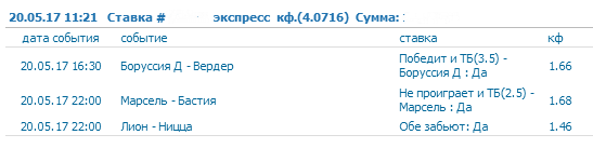 Прогноз на матч: Боруссия Д. - Вердер и Марсель - Бастия 20/05/2017