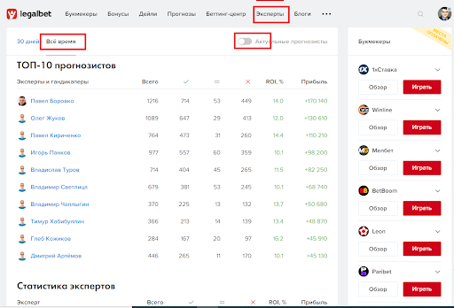 Ну а если захотите посмотреть статистику прогнозистов, которые уже не работают на Legalbet, то вновь открываете раздел «Эксперты», переключаетесь на «Статистика», затем на «Всё время» и убираете галочку с «Актуальные прогнозисты».