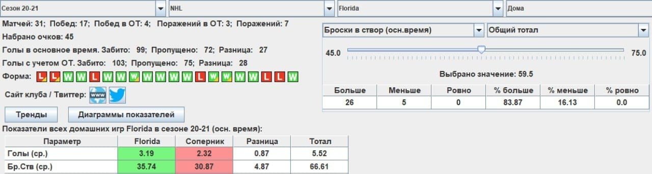 Средний же тотал по всей лиге — около 59,5 броска за 60 минут. На этом фоне выделялась домашняя «Флорида», которая вместе с соперниками обеспечивала в среднем 66,61 броска. С учётом плей-офф проходимость по ставке на ТБ 59,5 составила 83,87% (26 побед против лишь пяти поражений).