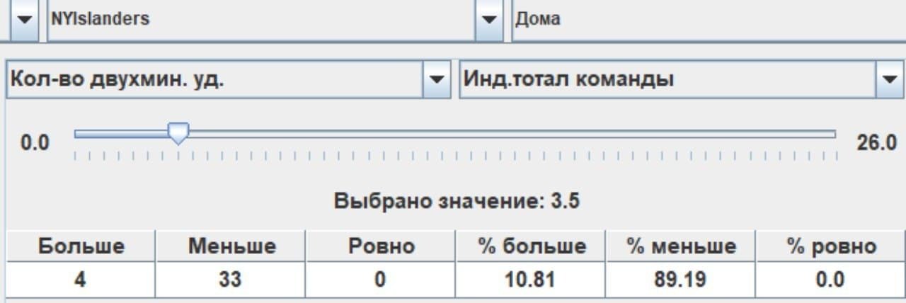 Если брать только домашние матчи, то тут уже самым аккуратным клубом стал «Айлендерс» — всего 2,19 удаления за игру. Проходимость ставки на ИТМ 3,5 с учётом плей-офф — 89,19% (33/4).