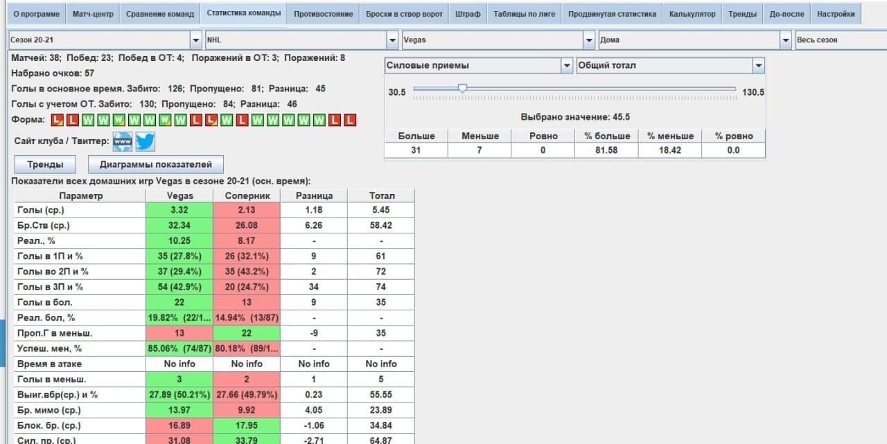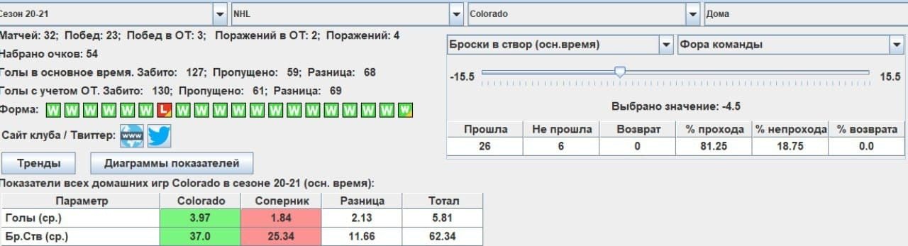 Теперь о самой бросающей на своём льду команде — «Колорадо». Средний тотал — аж 37 бросков в створ. С учётом плей-офф фора (−4,5) проходила 26 раз в 32 матчах. Также на скрине видно, что соперники «Колорадо» чаще играли на ТМ по броскам.
