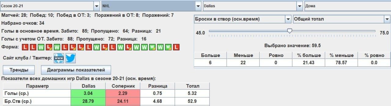 Видим «Даллас» на своей площадке и тотал бросков 59,5+ — ставим на ТМ.